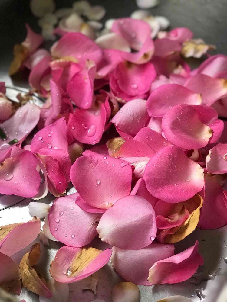 今朝、バラの花瓶の水換えをしようとしたら、バラの花びらがたくさん散りました。これはこれでキレイ!花瓶のバラは半分の本数に減っちゃった😅