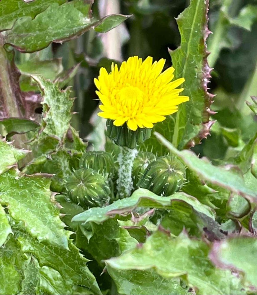 🍃雑草のようにいわれるオニノゲシ。『世の中に雑草という名の草はない』かつて昭和天皇が植物学者である牧野冨太郎の言葉を引用されて言われた言葉です。『雑草という草はない。どんな植物もみな名前があって、それぞれの自分の好きな場所で生を営んでいる。人間の一方的な考え方で、これを雑草と決めつけてしまうのはいけない』。と語っています。来春朝ドラの主人公になる牧野博士、植物への究極の愛を感じられずにいられません。中心部に小さな黄色い花をつけた鬼野芥子は我が身を守るように葉に鋭い棘をたくさんつけていました。