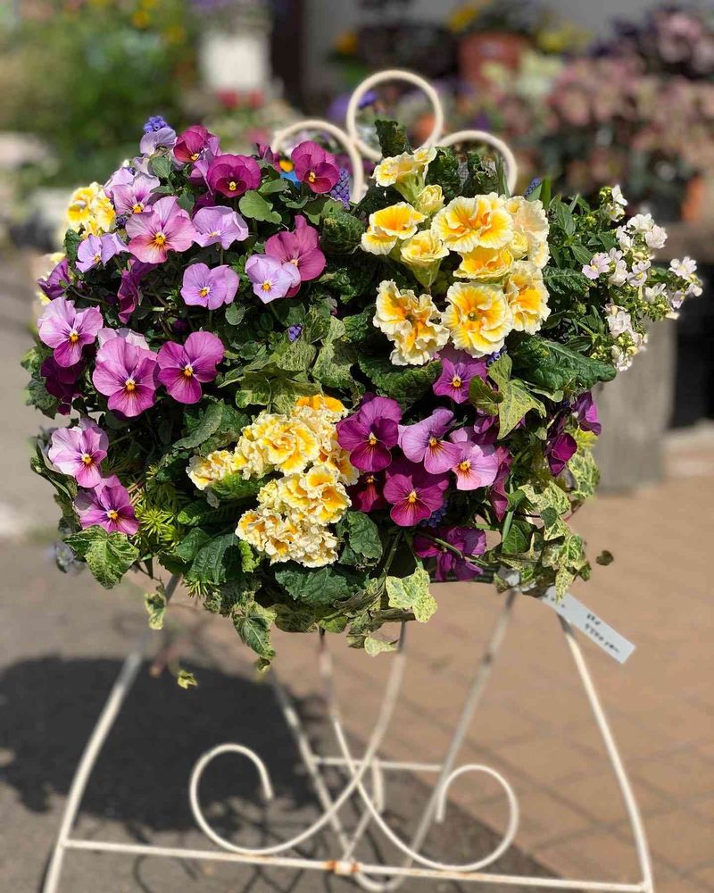 プリムラとビオラのハンギングバスケット♪ 次々咲きます!! 玄関先に店舗入口に、贈り物に( ˘͈ ᵕ ˘͈ )いかがですか?