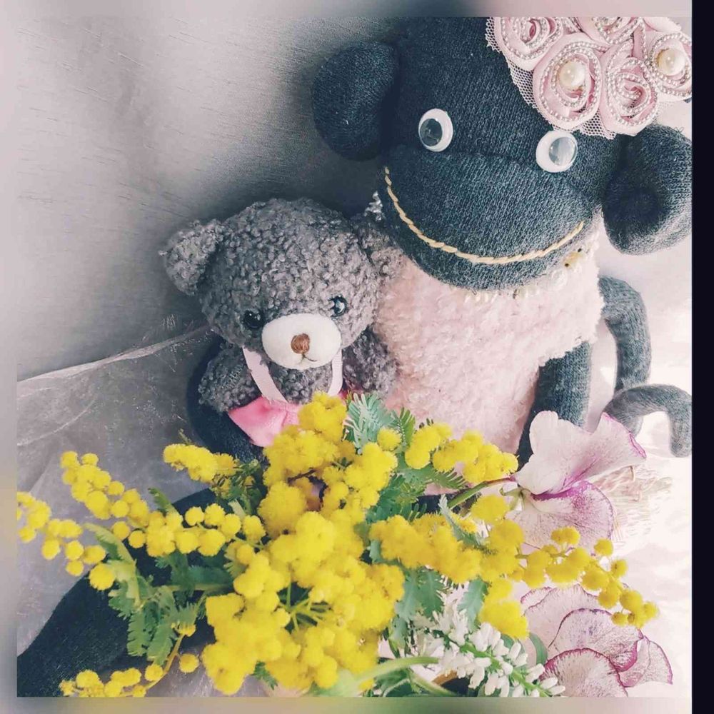 ムー様ソクモンちゃん熊ちゃんかわいいですね。ミモザのお花と似合ってますね♪。🙆♀️🌷❤️💕