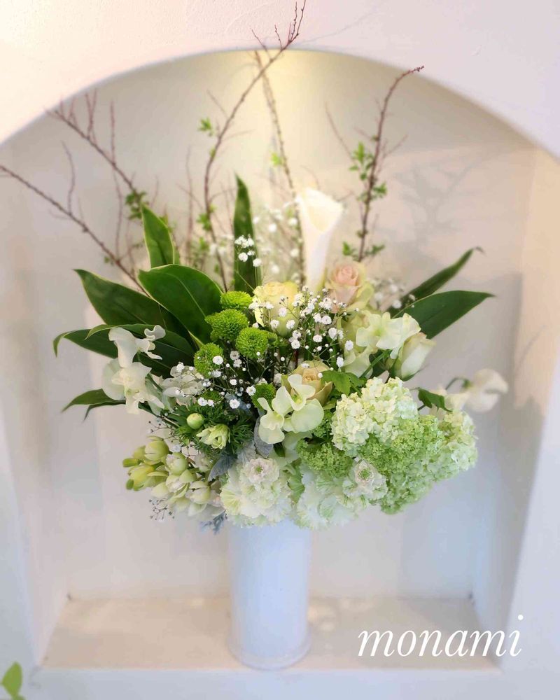 ビバーナムスノーボールに合わせて白とグリーンでまとめました(*´∀︎`*)ノ