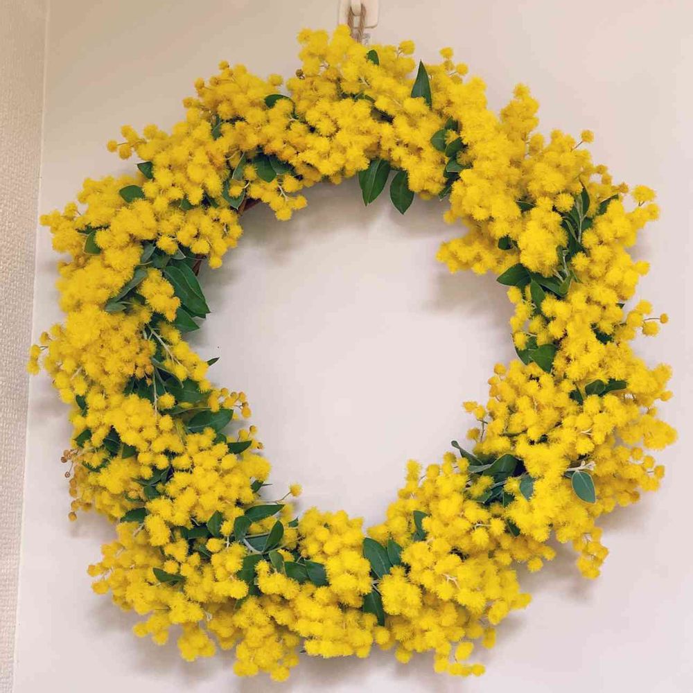 お庭のパールアカシアを切って、毎年恒例ミモザのリースを作りました。