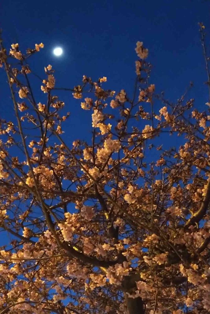 昨晩の桜とおぼろ月です。そして、今日はしとしと雨。桜は河津桜みたい、六分咲き位です🌸。
