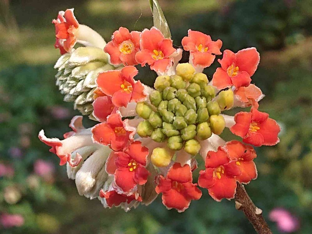 ミツマタといえば黄色花だと思っていましたが、朱色?もうあるんですね〜!華やか〜😍