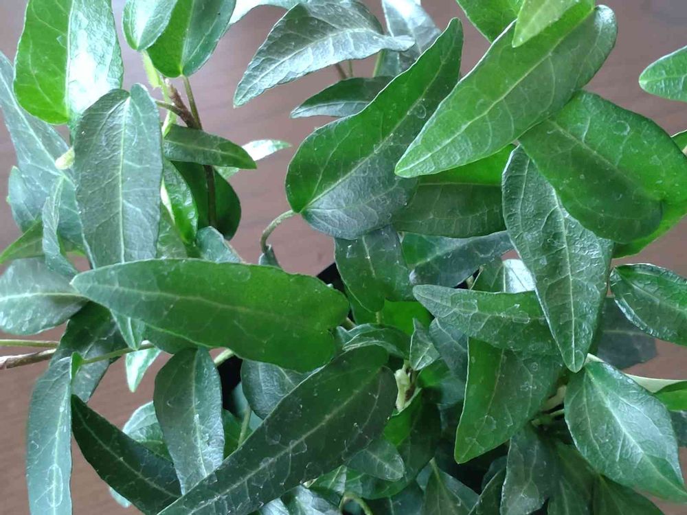 スマホを買い替えて最初に投稿した、お気に入りのブルーグレーのガラスの容器に入れて飾っていたヘデラ翼が、