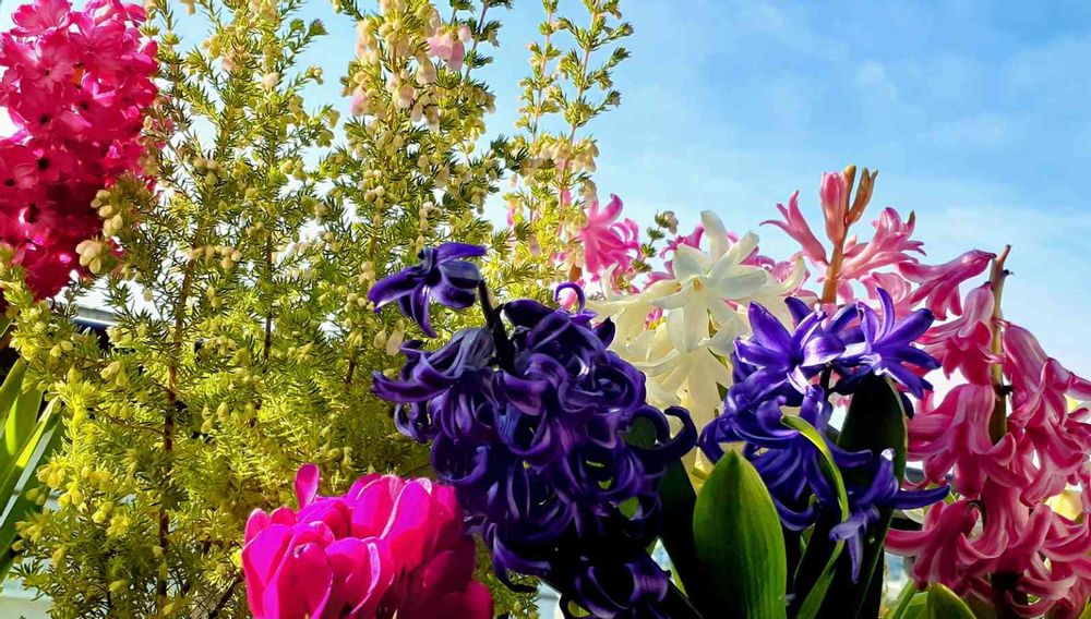 晴れた空に窓辺のヒアシンスとエリカ ほっこりピンクです