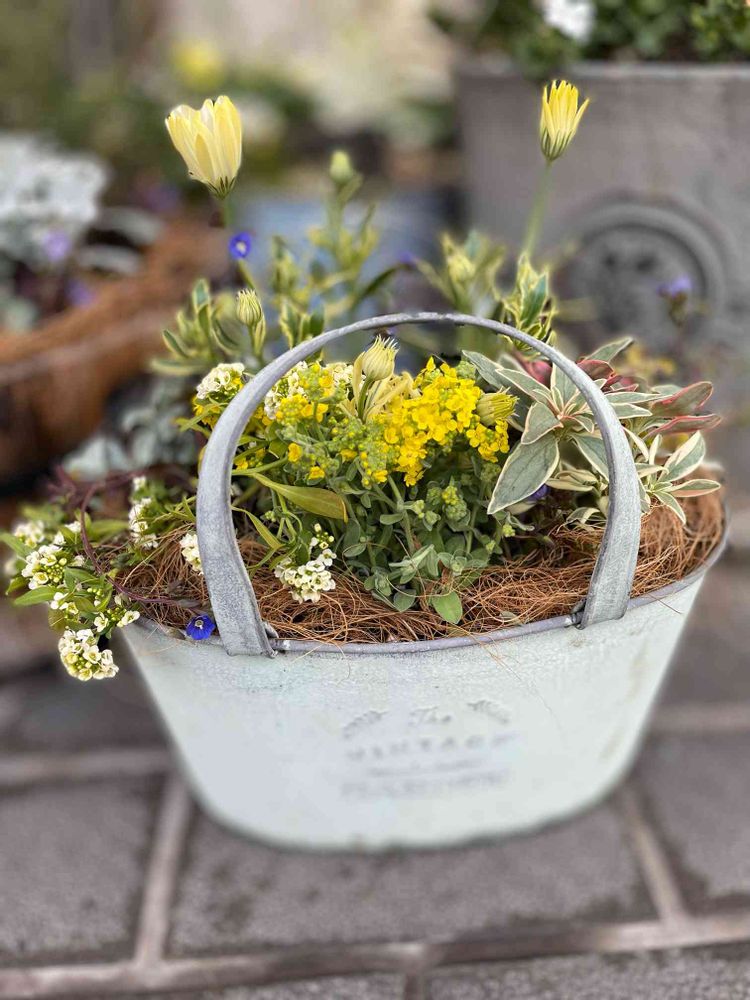 おはようございます😃春の寄植えしてみました。メインはオステオスペルマム ホワイトバリエガータです!斑入りは爽やか😊