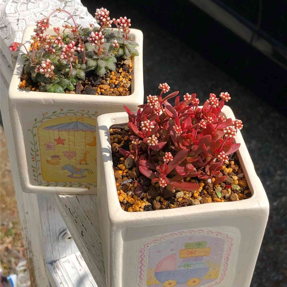 紅稚児の赤白可愛いですよね💕ベースの鉢はダイソーなんですよ。真っ白過ぎて💦…ミルキーホワイトで塗り直してからデコパージュしました✨平らなのでやり易かったですよ٩( ᐛ )و ✩