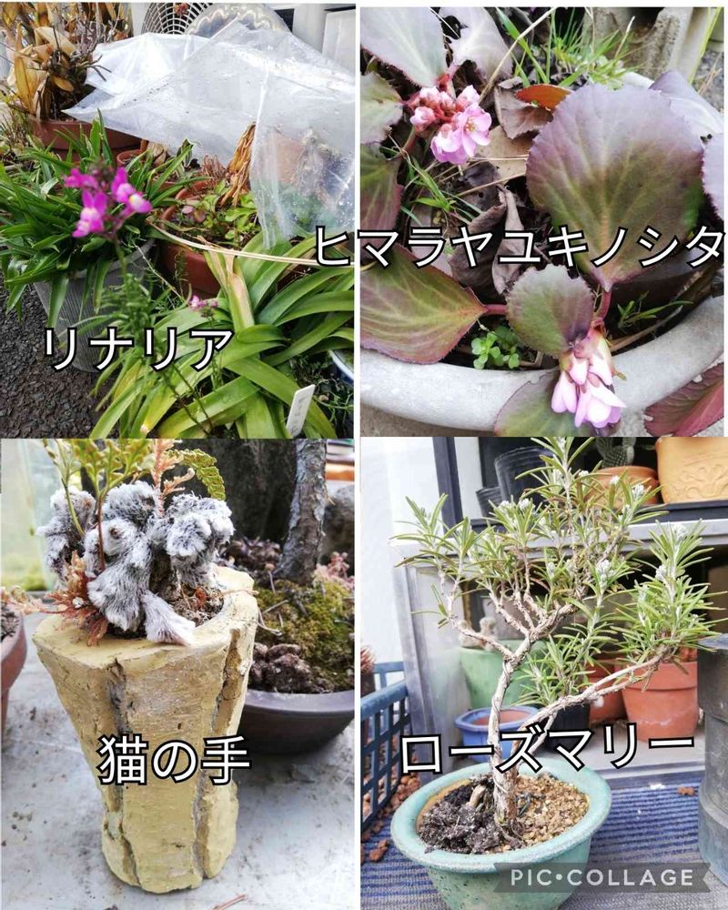 ヒマラヤユキノシタの花が 増えていました テラコッタに猫の手 ローズマリーの盆栽仕立て