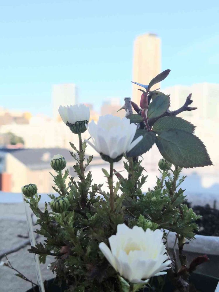 薔薇の鉢植えにノースポールさんがシェアしてました🌼