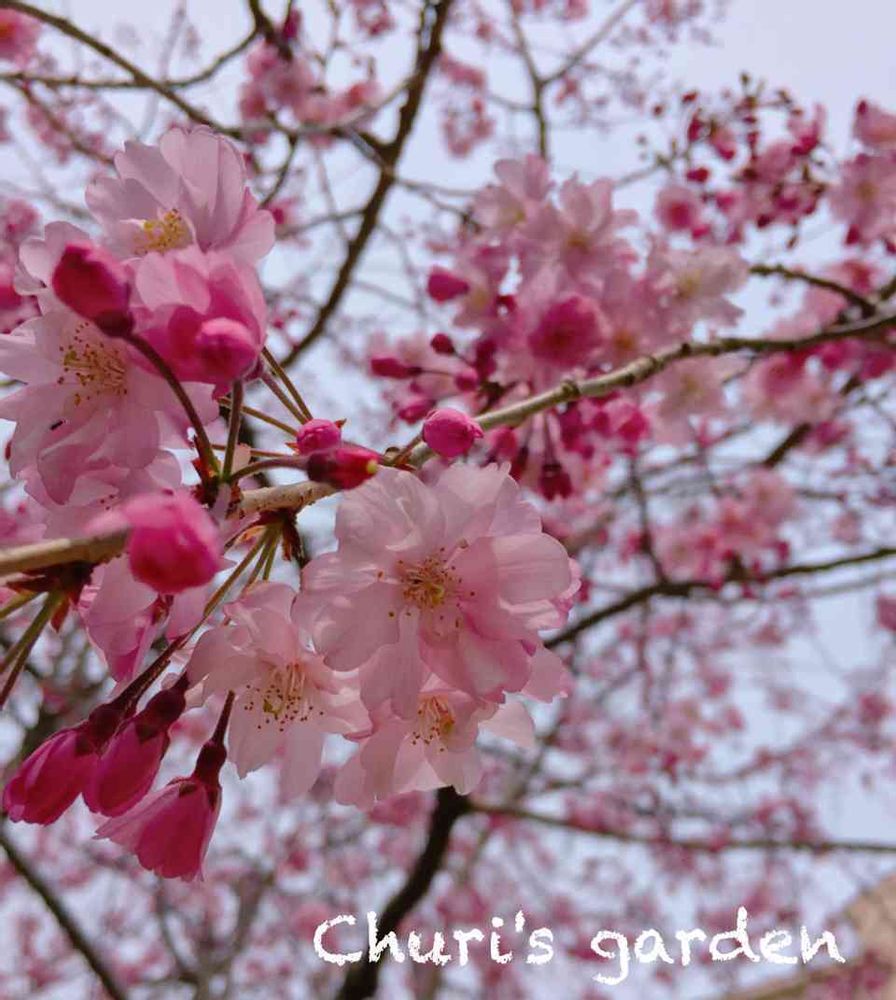 この枝垂れ桜、ツボミと花びらの縁取りが濃いピンクで大好きです💕