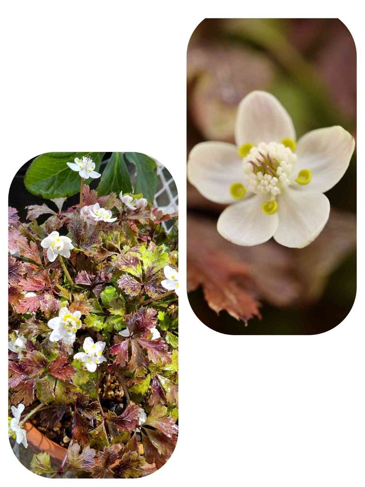 外出ししてたこのバイカオウレン、寒さでかなり葉が紅葉してのが少しづつ緑を戻しつつ可愛い花を咲かせ始めました。