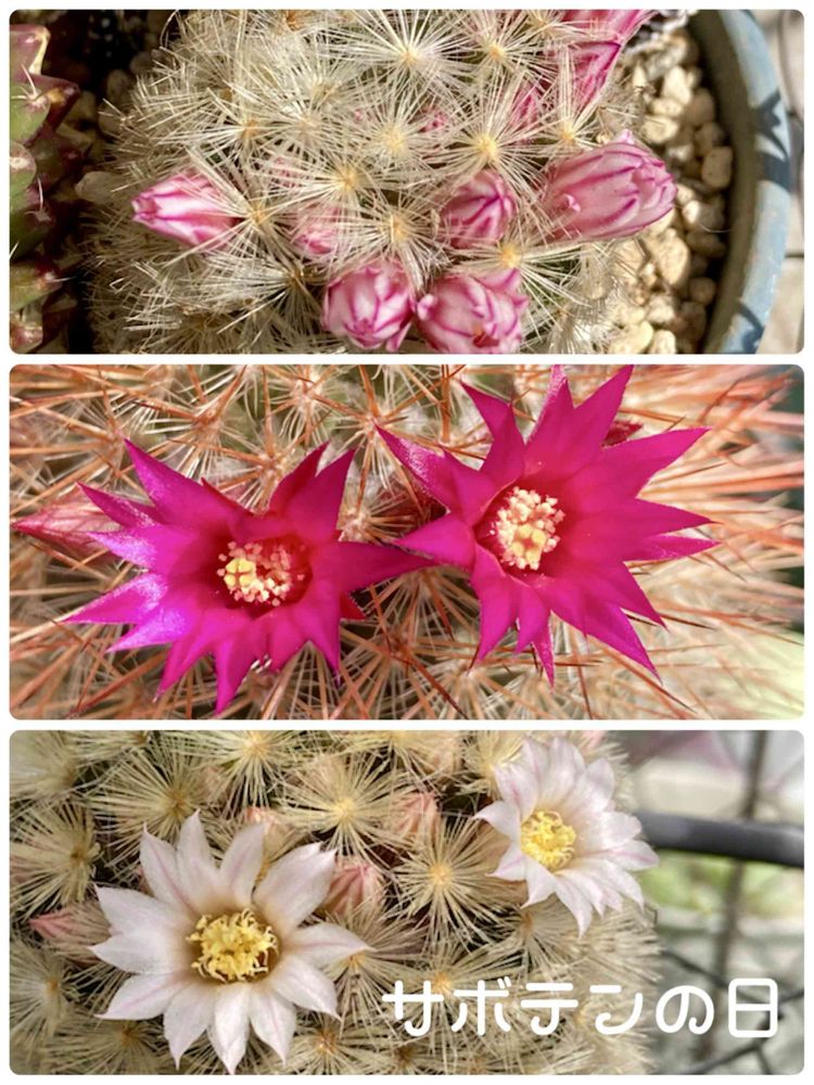 かわいいお花が咲いてますネ💕3つのサボテン🌵さんにいっぺんに💕