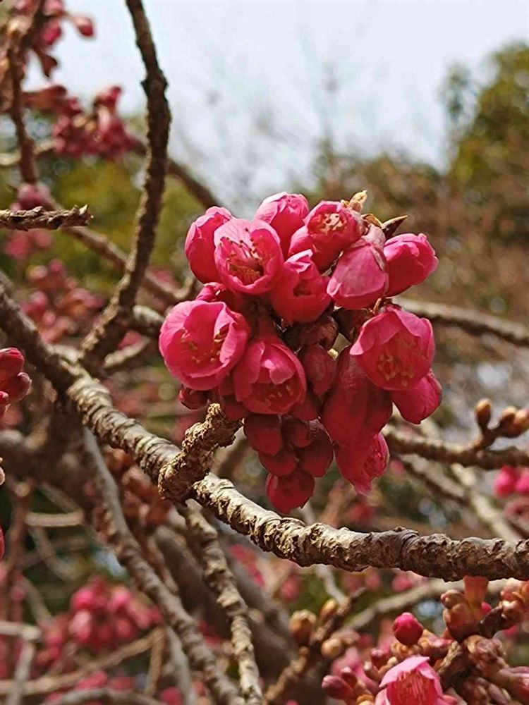 濃いピンクのカンヒザクラ🌸綺麗です。