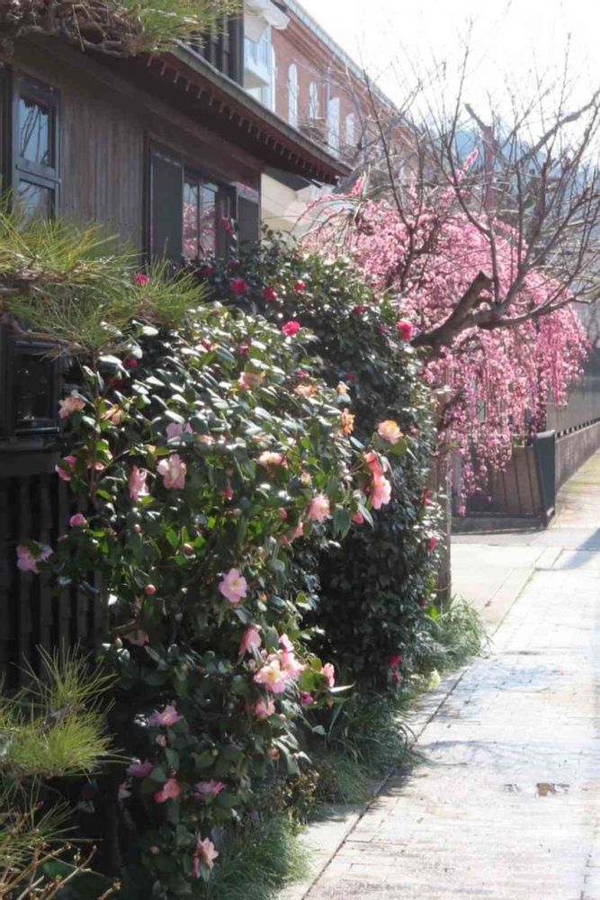 散策路沿い、椿花と枝垂れ紅梅に囲まれ趣のある素敵な和風家屋がありました。