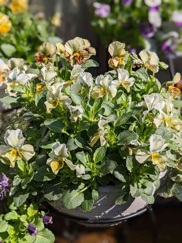 神戸べっぴんさんビオラの幻夢を3苗、8号カップ鉢に植えたらモリモリ💪溢れてしまいました😆👍