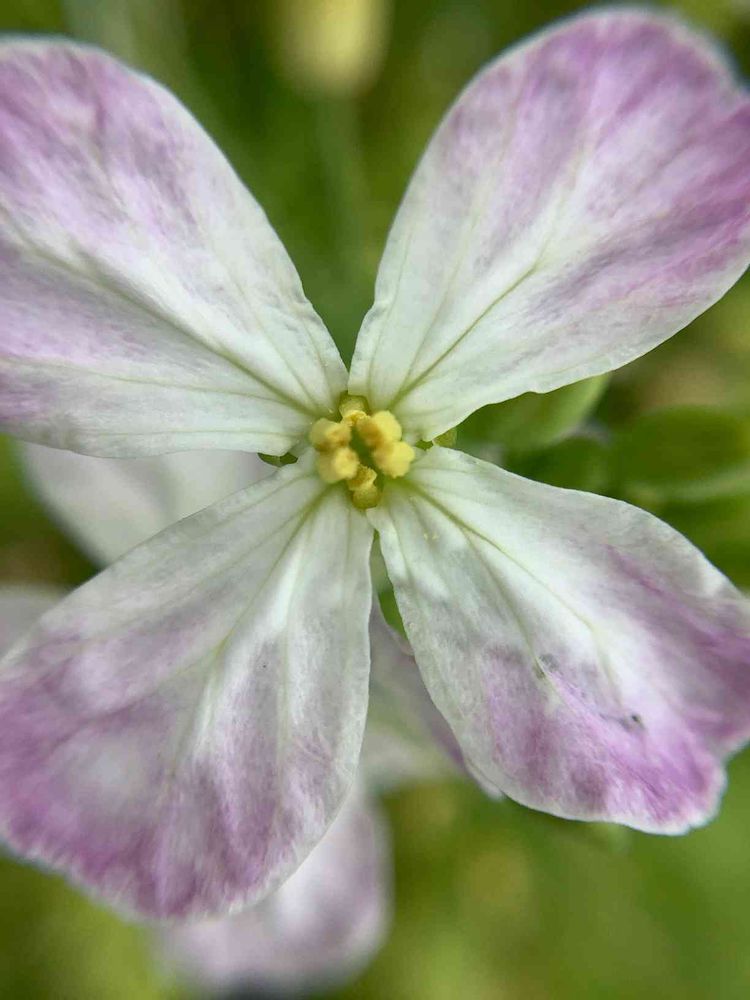 大根のお花って初めて見ました。色がきれいですね〜白くて淡紫色が少し。花びらは4枚なんですね…。新しい事知りました。ありがとうございますm(_ _)m