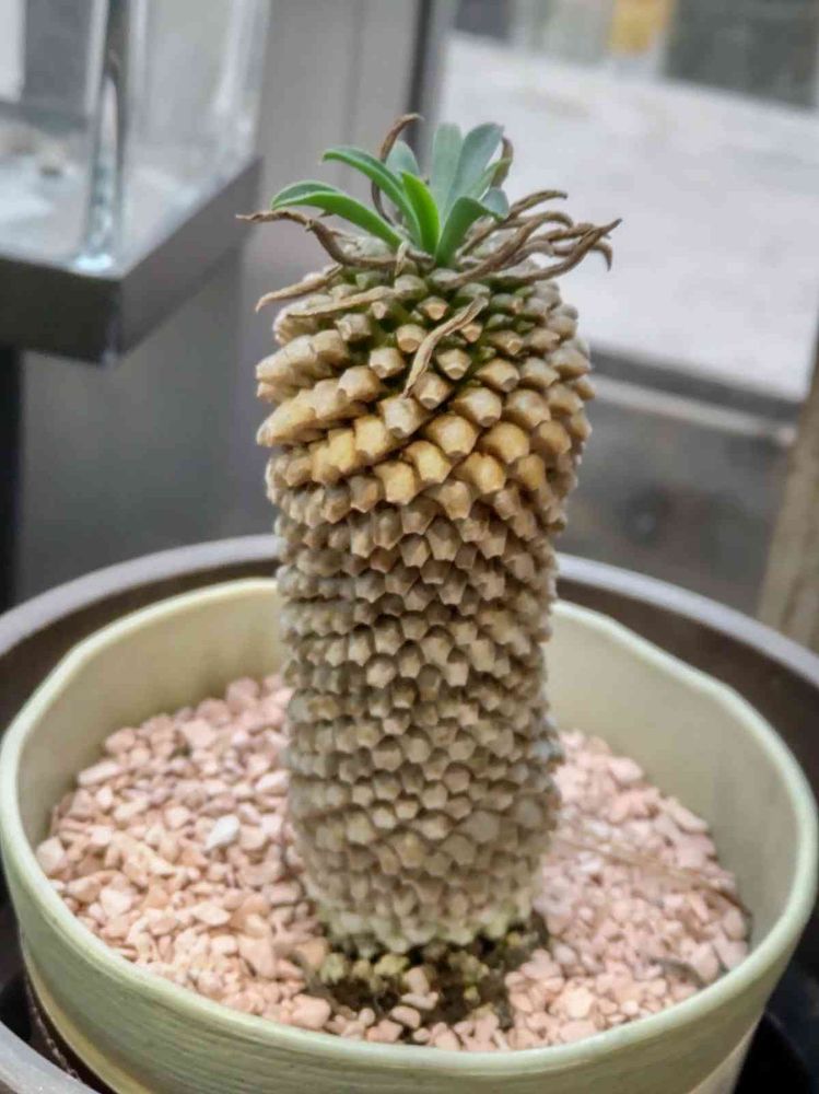 パイナップルみたいな株姿の観葉植物 ソテツ キリン(蘇鉄麒麟)は その見た目から ユーフォルビア パイナップルコーンとも呼ばれます。