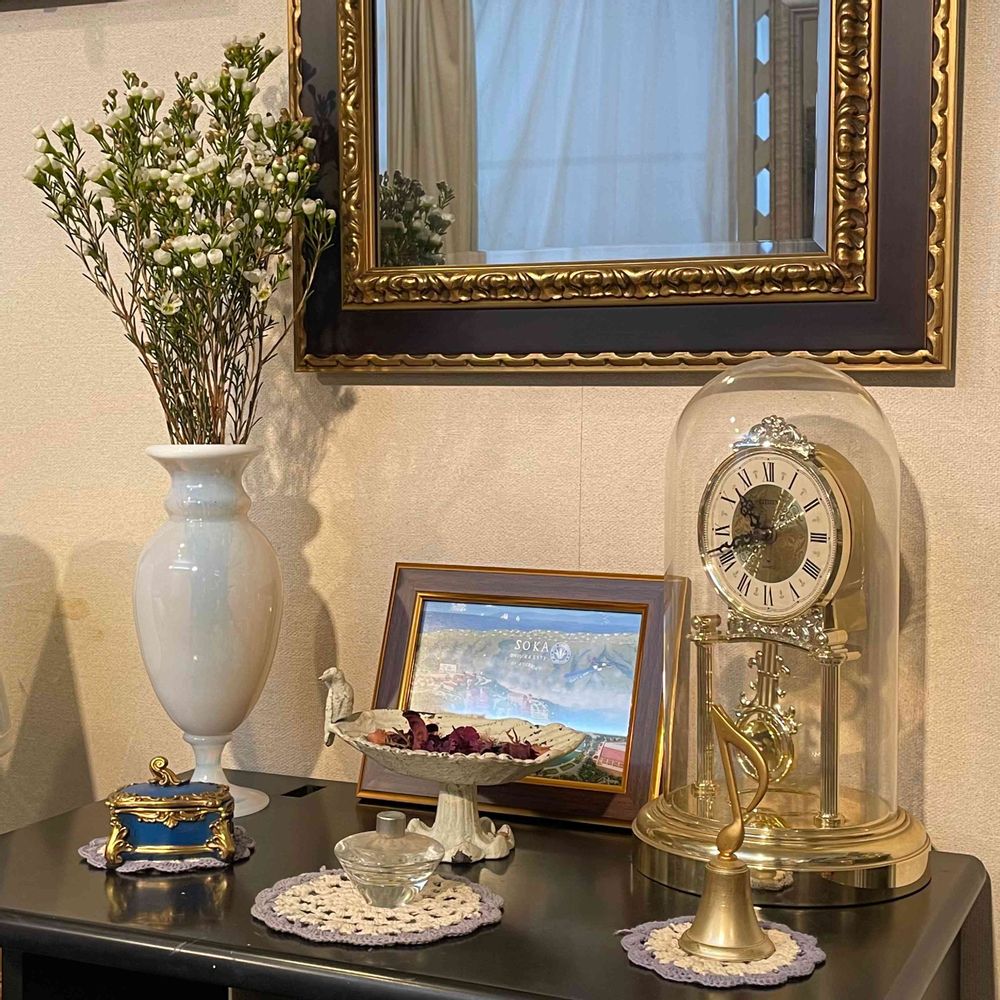 壁掛け仏壇「鏡壇ミラリエ」に今日(3/12)の誕生花の「ワックスフラワー(カメラウキウム)」を飾ってみました。