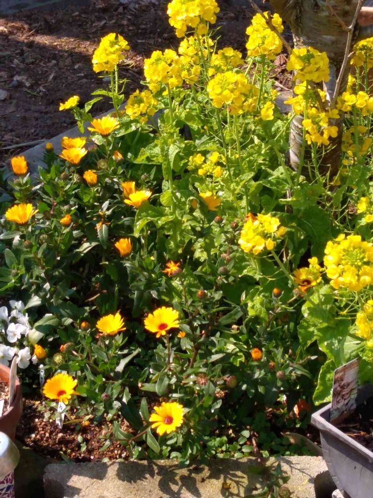さん、菜の花は昨年のこぼれ種です。庭のあちらこちらに芽がでてきたので、桜🌸の樹の下にぐるっと集めてみました。カレンジュラは寄植え解体したものです。別名冬知らずの名の通り、寒い冬の間もずっと可愛らしい花を咲かせ続けてくれました☺️ 3品種植えてあり、それぞれオレンジバウムクーヘン、チーズトルテ、アーモンドミルクという美味しそうな名前がついています😚