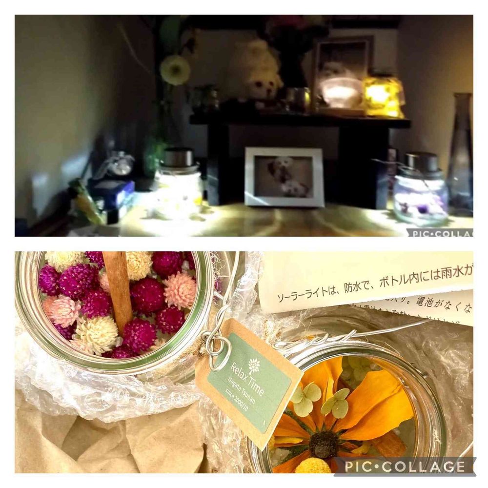 今回愛犬みるくちゃんが旅立たれた事で、夜真っ暗でかわいそうと、ソーラーランタンを2つもお届けさせて頂き写真も送って頂きました(写真上)