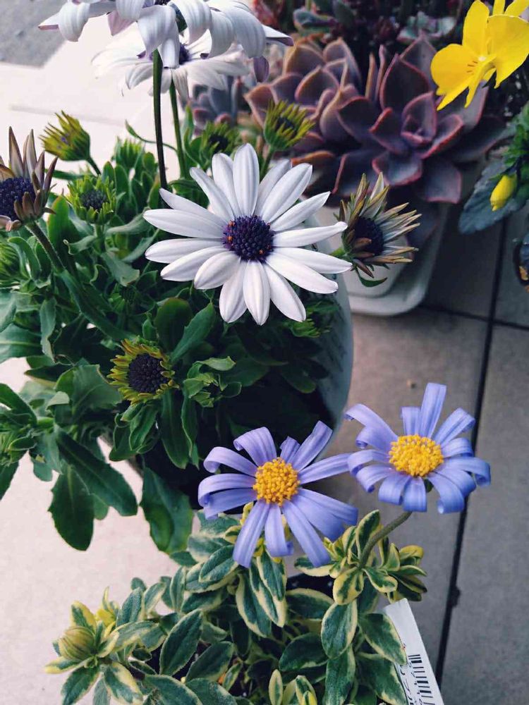昨日買った、斑入りのブルーデージーとオステオスペルマムのアキラ。