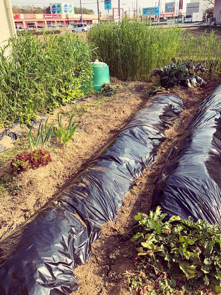 作物を片付けて、二筋耕して、石灰と燻炭をまき、ヌカを表面にまいて、マルチしておきました。