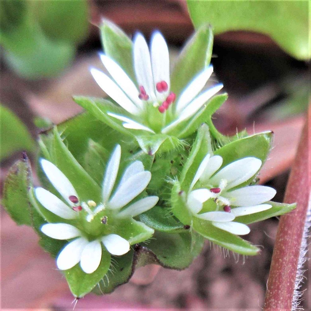 ハコベの白い花が咲き赤蕊もたくさん見つけました。