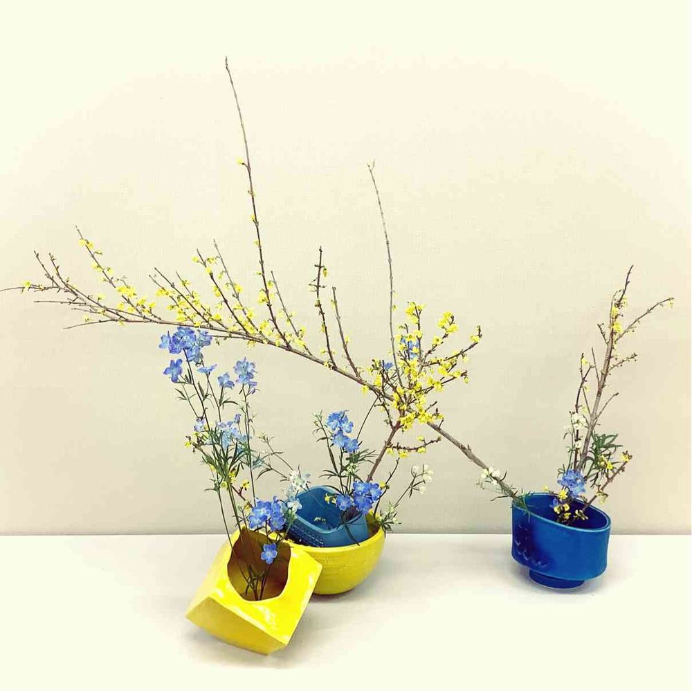 れんぎょうと青いデルフィニウムのお花達、そしてウクライナ🇺🇦カラーを意識された器達が、ステキにマッチしていて、とても優しい作品に感じました💗