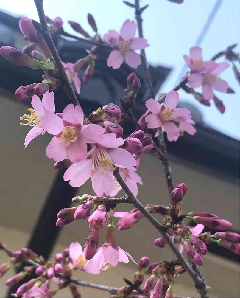 おはようございます。いい天気です。散歩道のお宅のお庭でオトメザクラが咲き始めました。