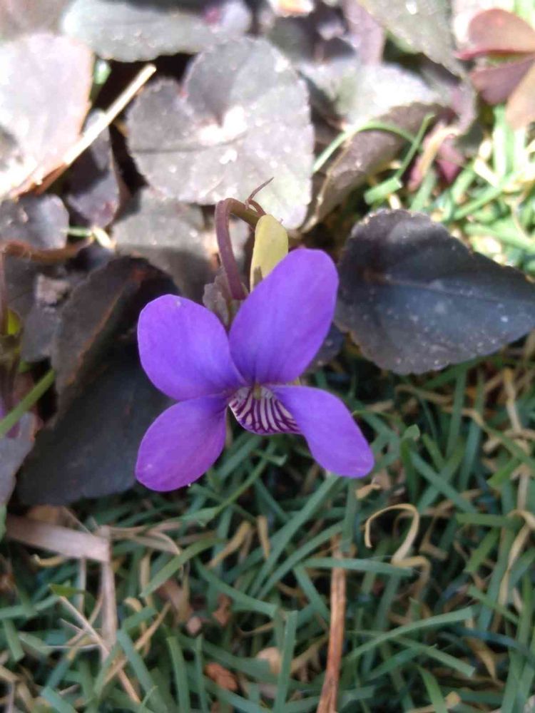 玄関ポーチのタイルと下の地面に敷いている防草人工芝の隙間から、こぼれ種のすみれが🥰