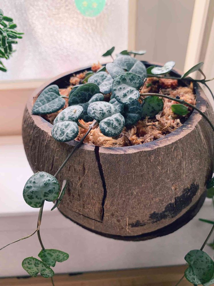 ハートカズラをココナッツの鉢に植え替えたら、ココナッツ鉢が、バキバキ割れました😭湿度とかの影響?でも、雰囲気可愛いのでこのままで👍