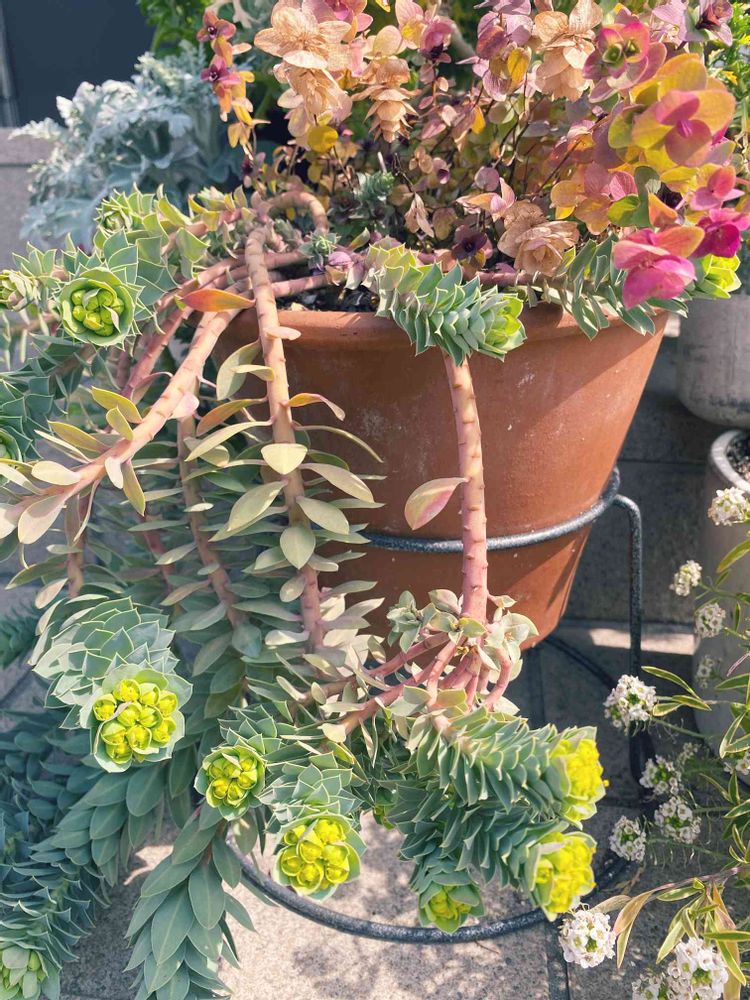 紅葉したままのオレガノケントビューティーと、ユーフォルビアの花?の黄色の組み合わせきれい