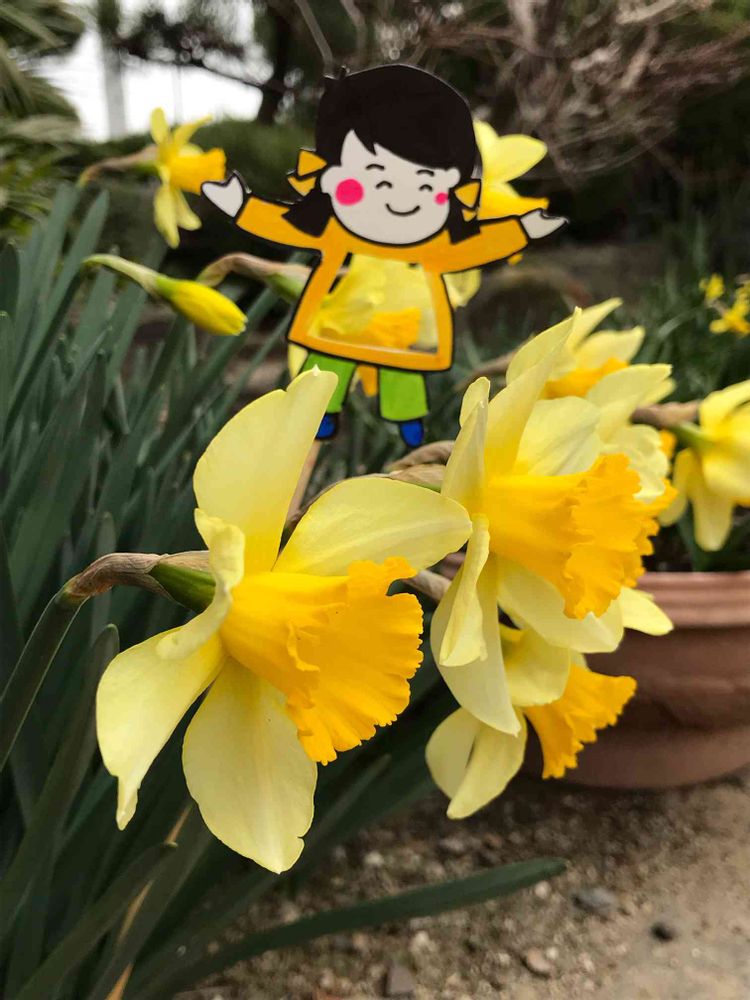 水仙が同じ方向を向いて咲いていたので、最初はとん子が水仙に乗って、片手をかざしながら水仙と同じ方向を向いている場面にしようと思ってたんだけど、自分に画力が無いのにすぐ気付き、簡単なポーズになってしまいました➰😅💦