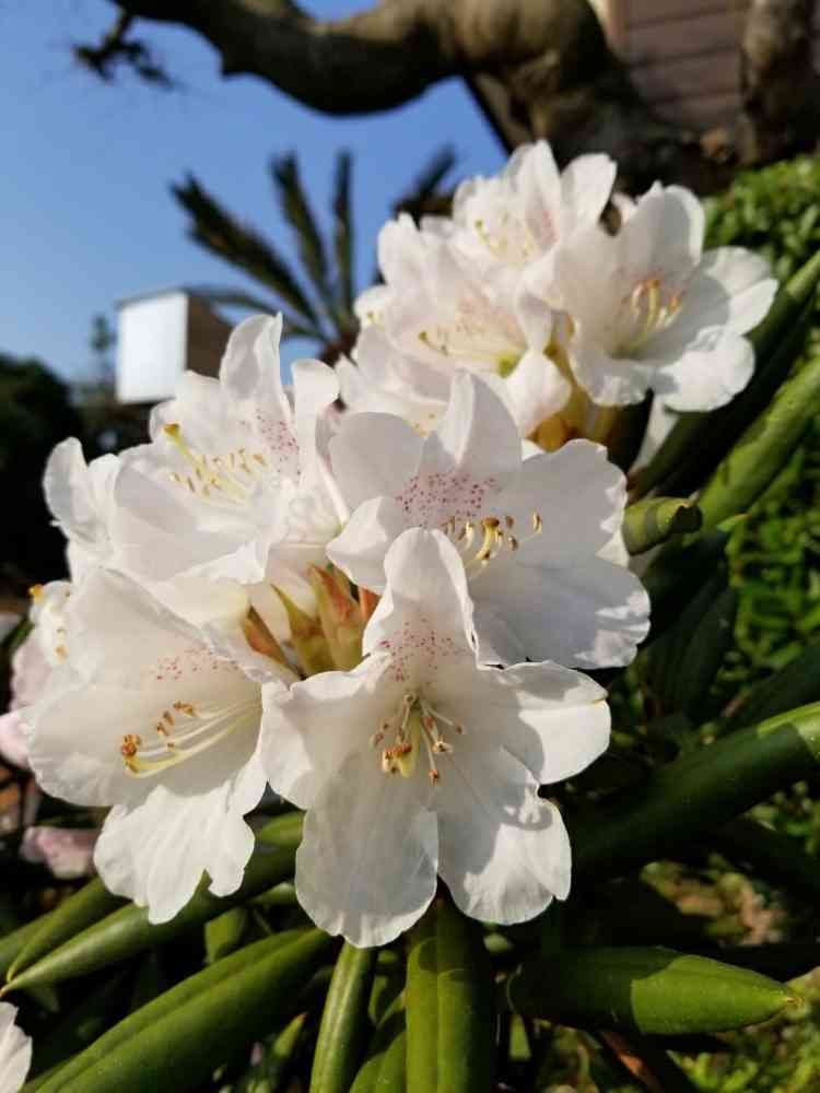 シャクナゲ蕾のピンクと花の白、薄いピンク、きれいです。