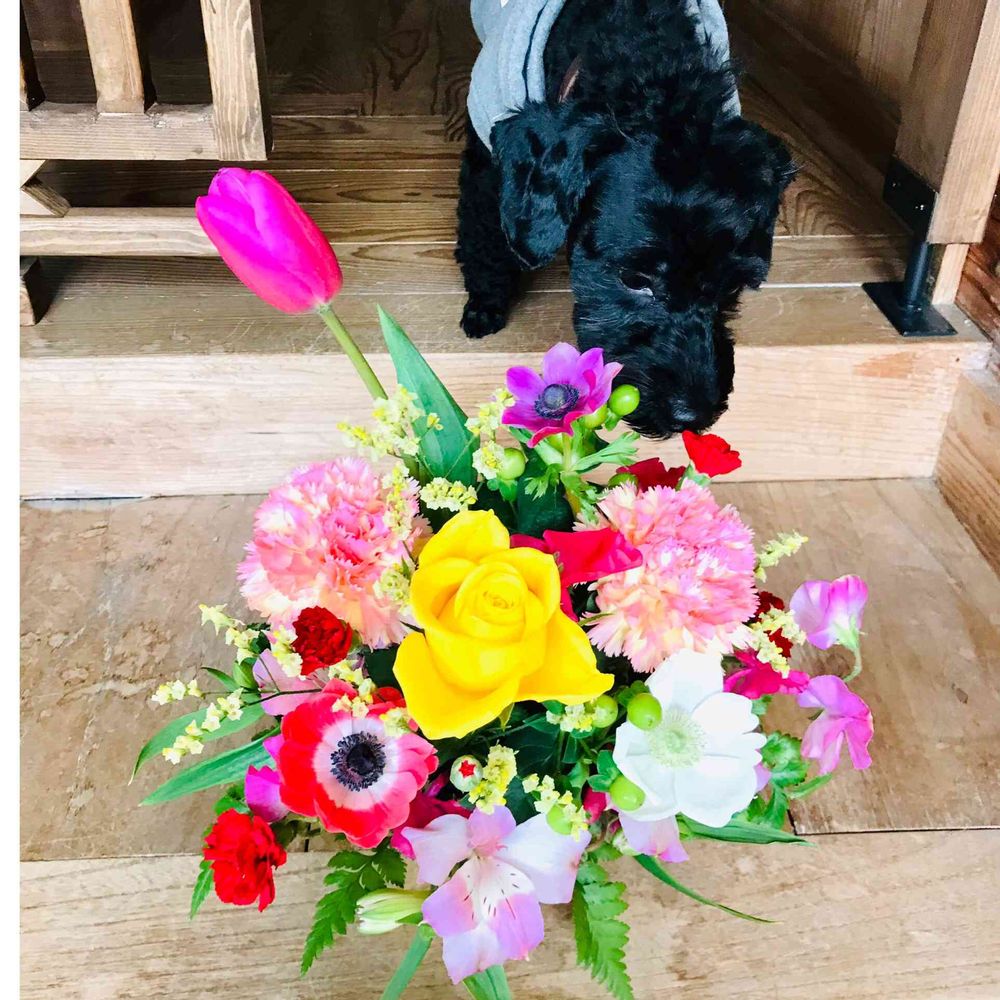 こちらのワンちゃんと、お花も素敵な写真ですね😊