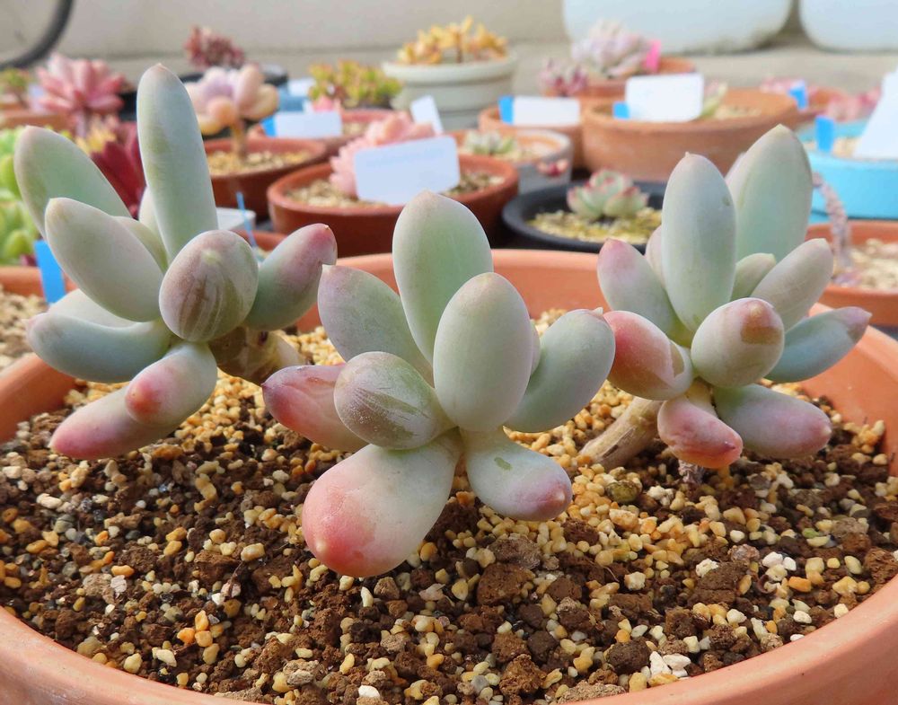 だいぶ前に植え替えた時に葉挿しにしておいた子株たちが同じくらいのスピードで大きくなってきた。下の方の葉だけ少しピンクが混ざるところまで,兄弟株はやはり似ている。