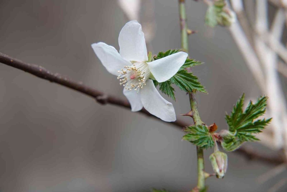 特徴的な葉はまだ開き切らず、待ちきれずにたくさんの花が咲いています。美しい花と鋭い棘、