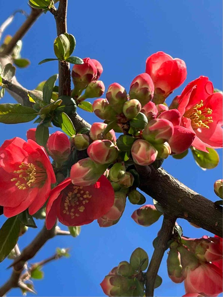 青空に陽光を浴びている赤いボケの花👍 良いですね〜😊