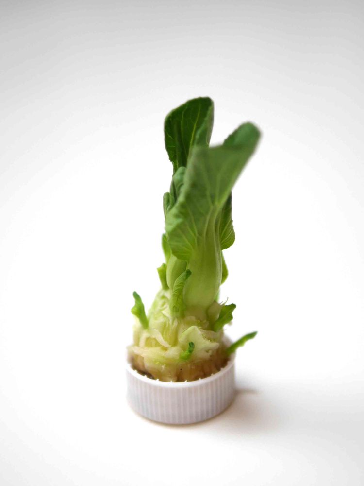 青梗菜の芯の部分をペットボトルキャップに乗せて育て始めています。
