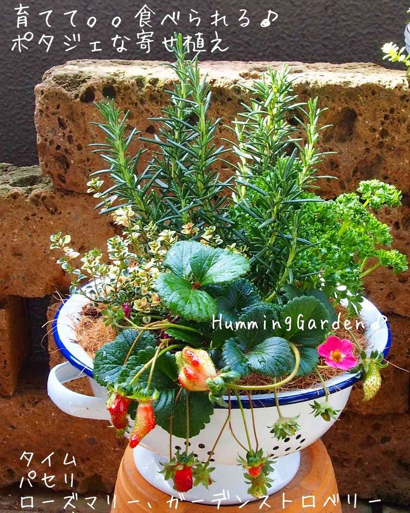 コランダーに♪ガーデンストロベリーとローズマリーの寄せ植え