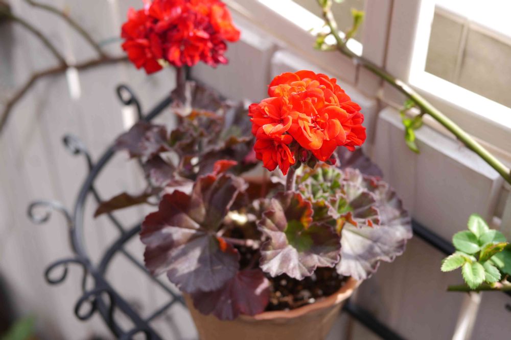 寒さで葉がチョコレート色になったゼラニウム。この差し色が私のベランダの主役です。