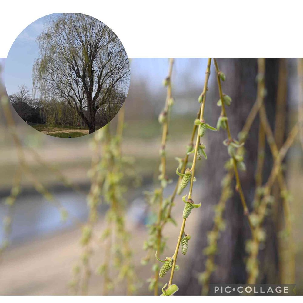 小さな緑のとうもろこし🌽のようなモノが柳の枝に芽吹いて風に揺れていました。