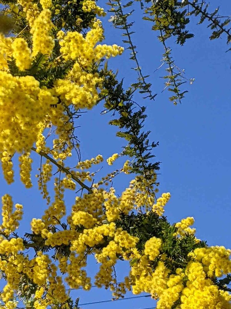 明け方に降った雨も止んで、雲ひとつない青空にミモザが満開でした。ウクライナの🇺🇦みたい。