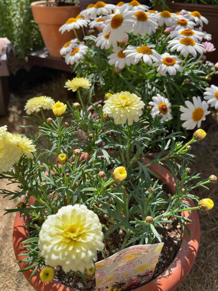 後ろの白いの(スマッシュホワイトアイ)がほんとによく咲くので、黄色のポンポン咲きのも買ってみました。どんな風に成長するか楽しみ😊