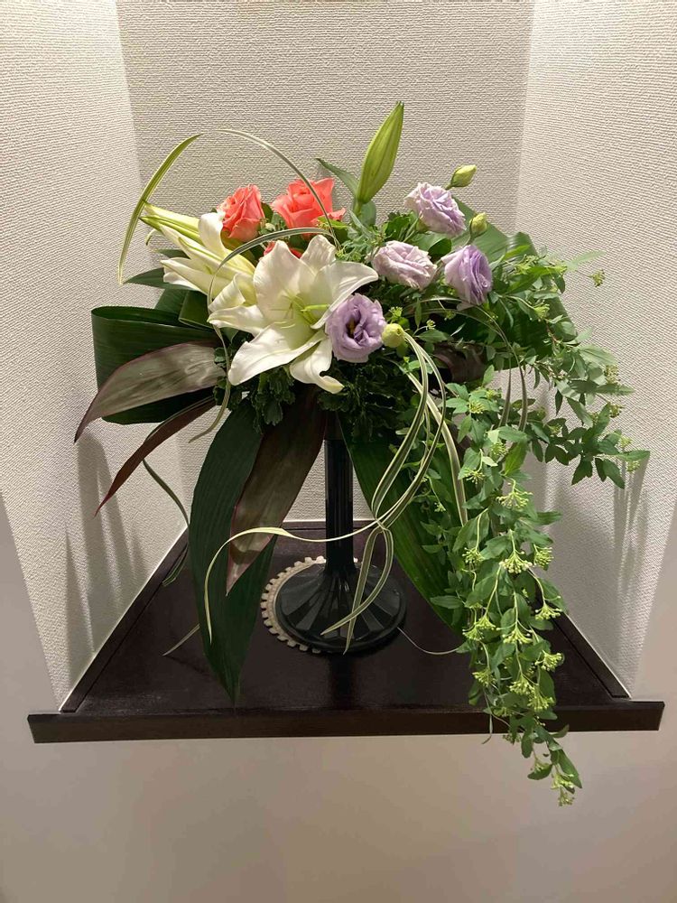 ハランとドラセナでリボンのように形作って、オリエンタルリリーで華やかに。コデマリ、ミスカンサスなどで流れを作ってみました。