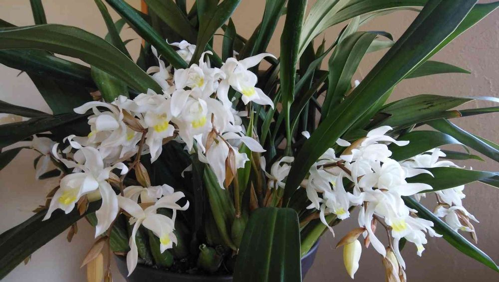 セロジネ…前回投稿した全体像です!お迎えしてから、もう何年もたちますが…鉢増しを繰り返してきただけで、株分けしたことがありません!💦なので、バルブがぎゅうぎゅうで…今年は、絶対株分けしないと…😅