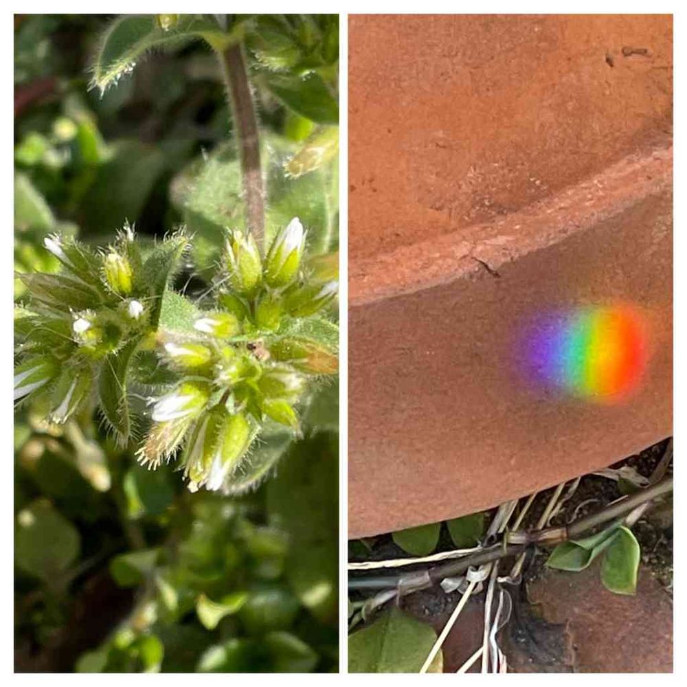 実家の石、というか植木鉢なのですが、虹が出ていたので、近くのオランダミミナグサと合わせて🌈