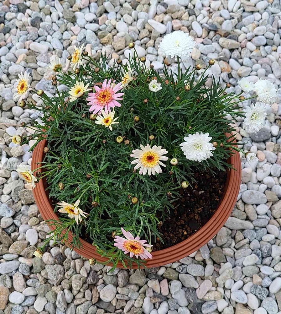 マーガレットぽぽたんアプリコット2苗とマーガレットモリンバタブルホワイト1苗の寄せ植え。