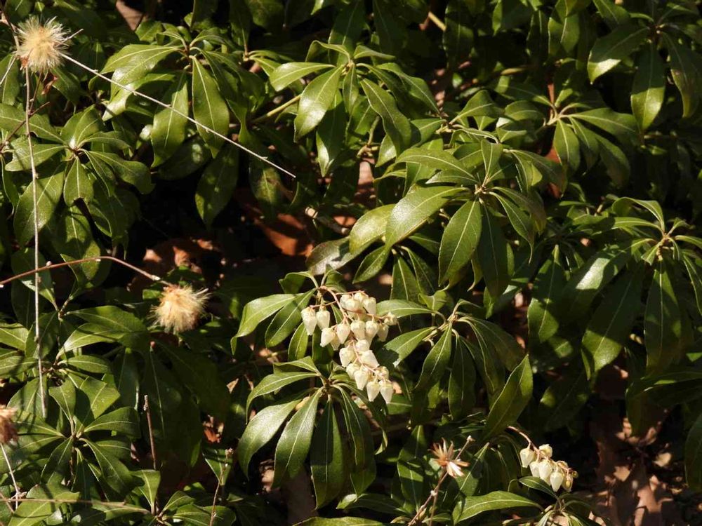 冬の山路を優しい綿毛で和ませてくれたコウヤボウキが、アセビの花にバトンタッチ。